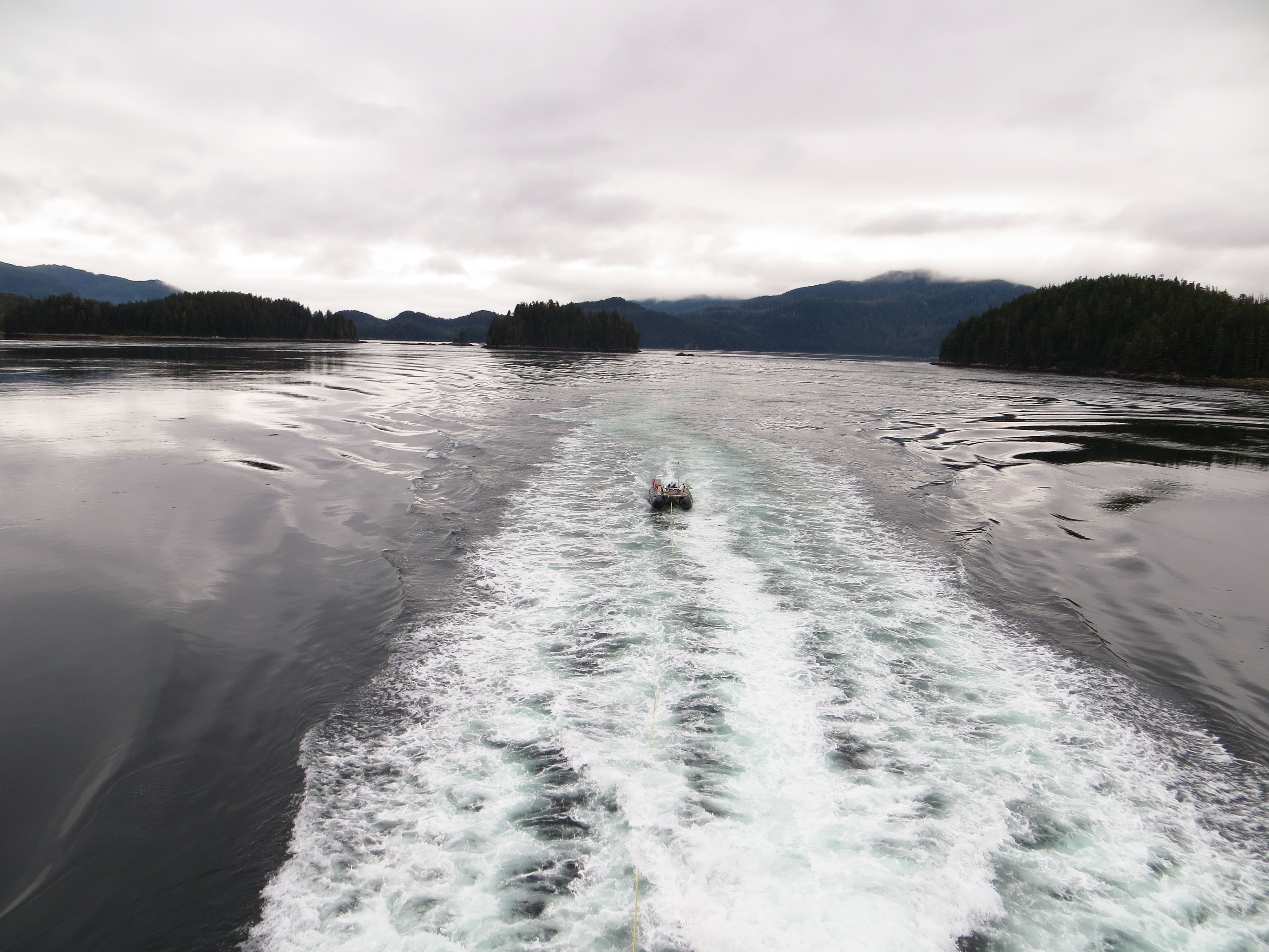 Luna compares her wingspan to the bald eagle’s.Chapel in the Russian Bishop’s House. The bishop for Alaska was housed in Sitka (New Archangel) under Russian rule.A native artist demonstration at the Sheldon Jackson Museum in Sitka.After our guided tour of Sitka our group of thirty one passengers went on board an Allen Marine (parent company of Alaskan Dream) tour boat for lunch and a whale and wildlife watching tour north along the coast of Baranof Island to where our cruise ship, the Alaskan Dream, waited at sea. We passed this eagle nest. Bald eagles make the largest nests of any bird, but they keep working on it over many years and reuse the same nests.Trucks don’t go to Sitka. This is a container barge we passed on our way up the coast.Looking back at the start of the cruise. The Alaskan Dream towed an inflatable boat used to take passengers closer to glaciers.