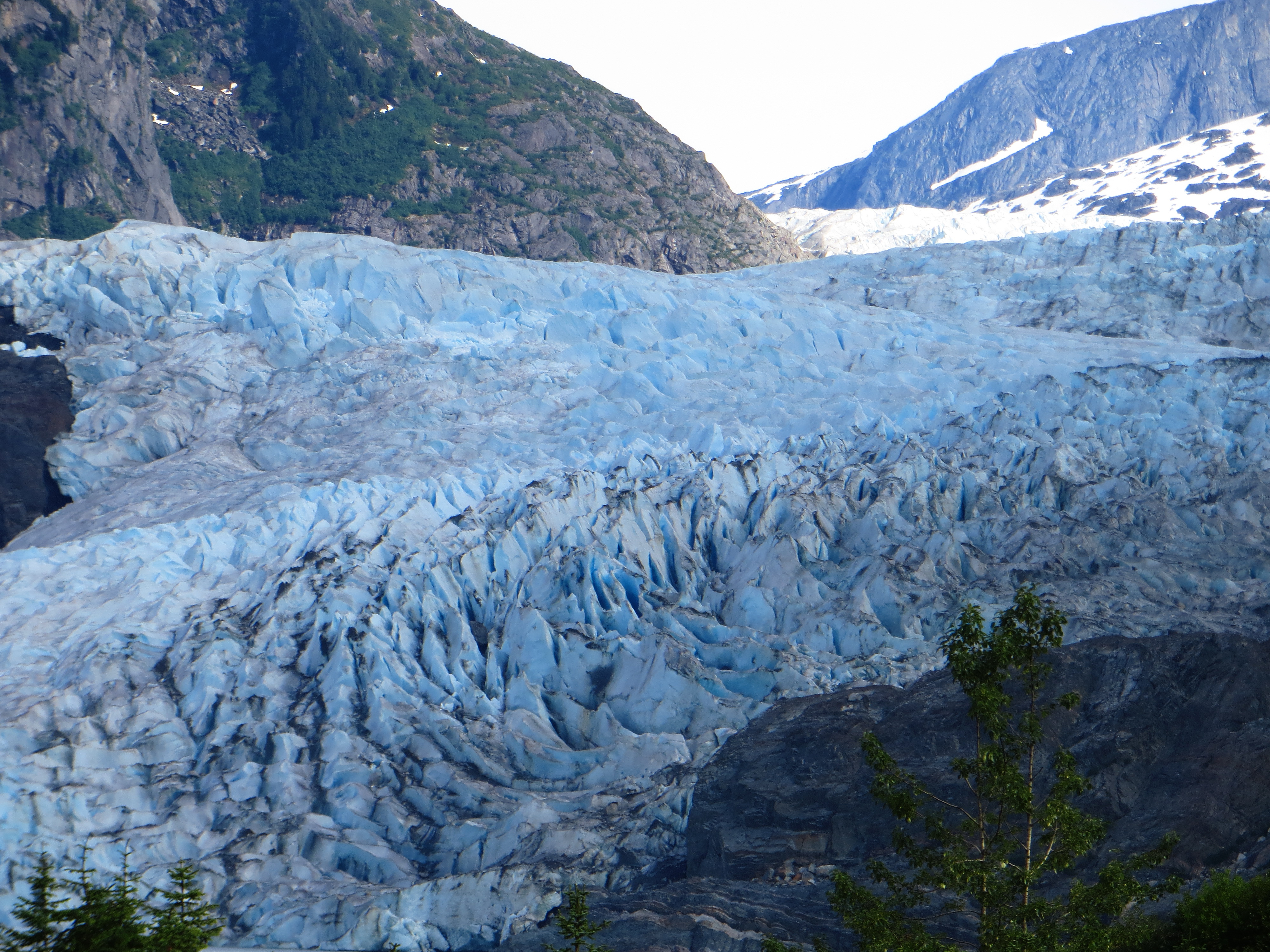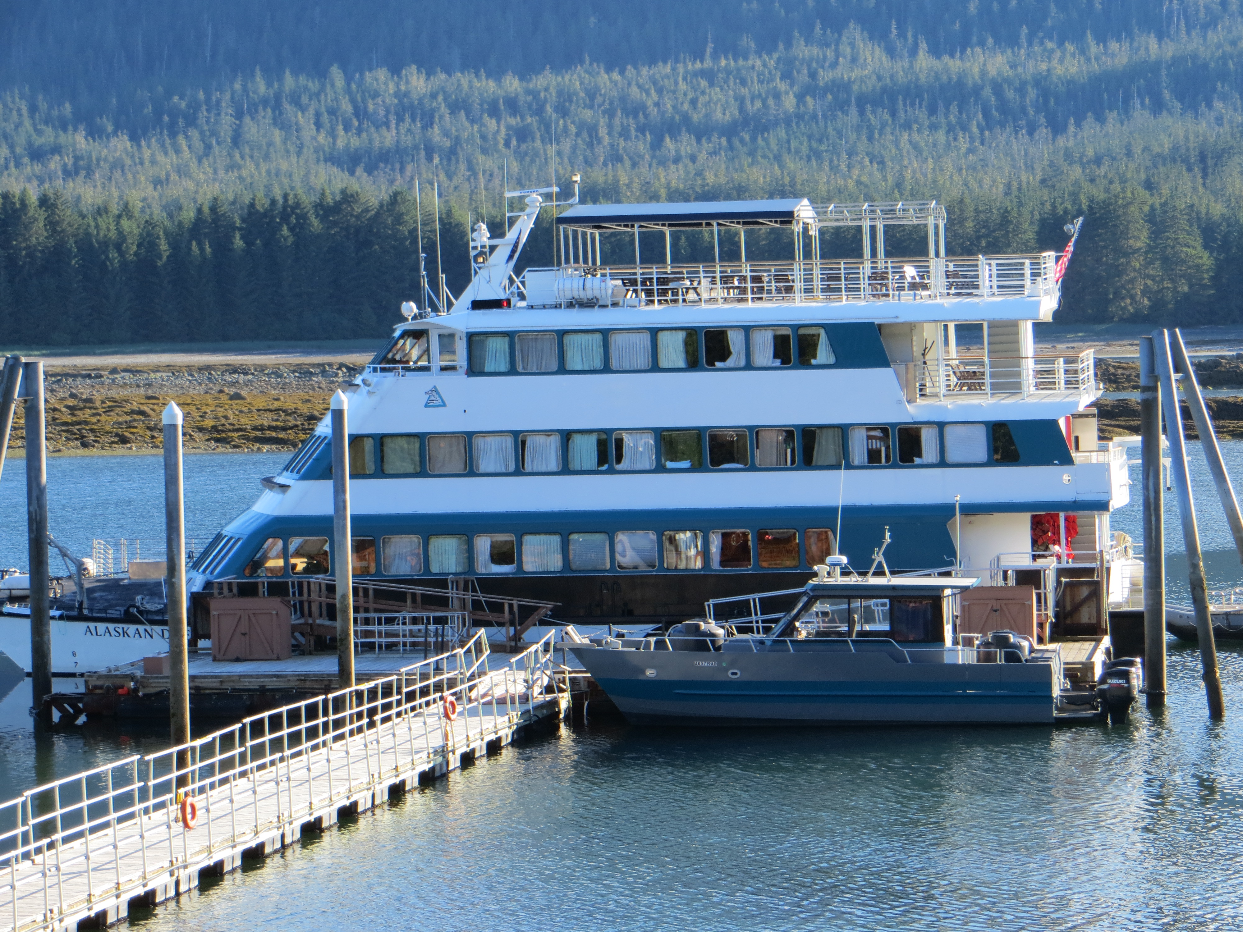 Luna and I took an eight day cruise of the inside passage on the Alaskan Dream. There were thirty-one passengers. I’d hoped there’d be other kids, but Luna was the only one. Still, she handled herself gracefully with the other passengers and had a good time. We left from Sitka in the afternoon and cruised toward Juneau overnight. On the way in the next morning we saw several groups of humpback whales, some bubble net feeding. We docked outside Juneau and a bus took us to the Mendenhall Glacier and then into the capital, which, like Sitka, can only be reached by boat or plane. Back on the “Dream” we cruised to Orca Point Lodge for an evening crab feed. That night we cruised on to Glacier Bay where we picked up a ranger and a Tlingit cultural liason for the day.