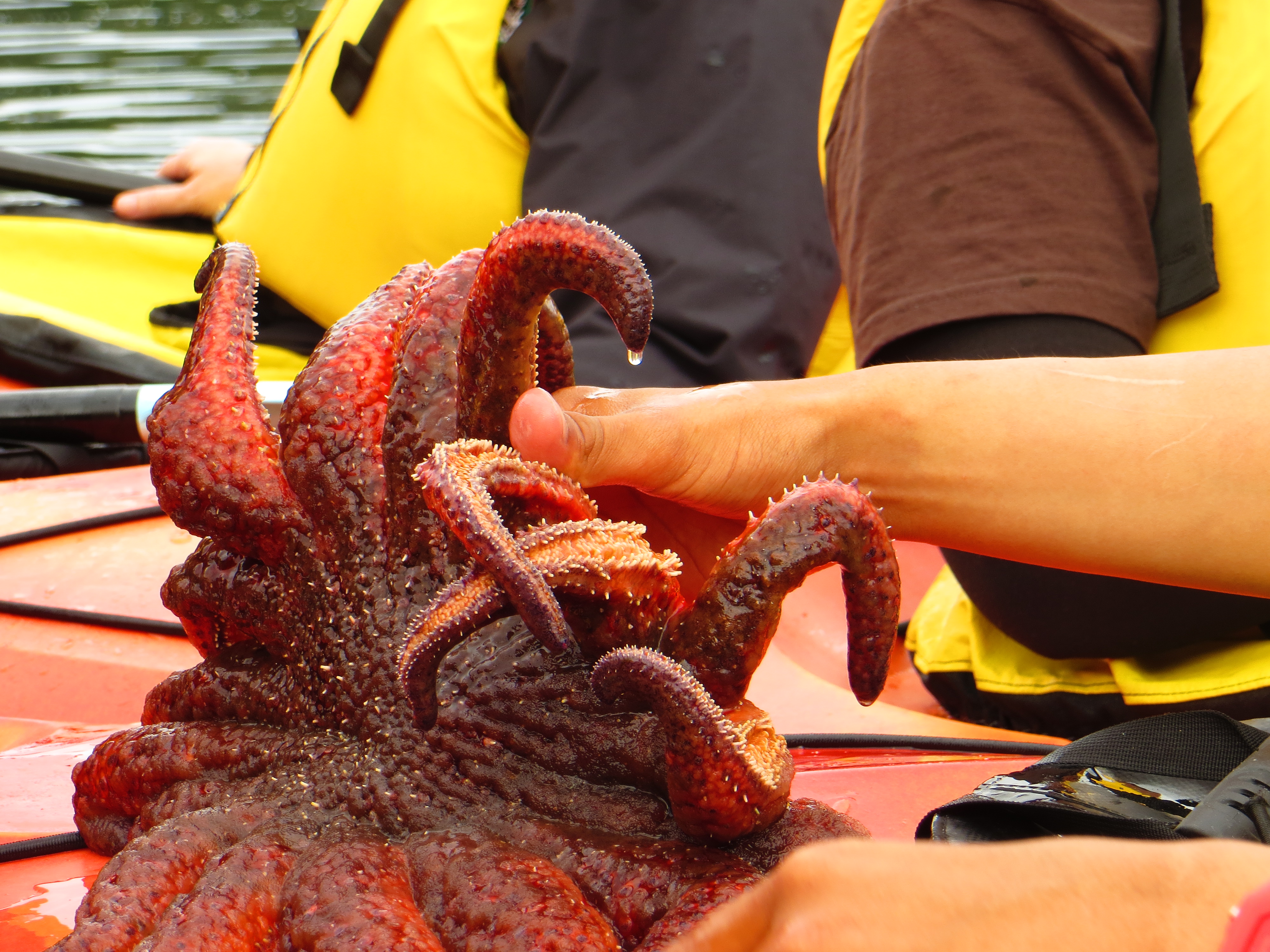 We were divided into four groups for the activities. Here our group huddled together to observe a sunflower sea star that Leonty scooped up.